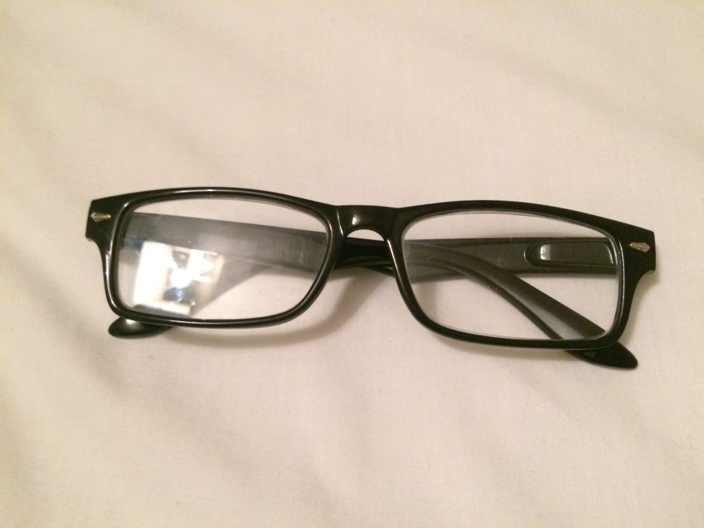 – A pair of black plastic glasses with a small silver fleck next to the lenses on each side near the hinges, which were put into somebody else’s bag by accident, and subsequently handed into Phil Henderson.
